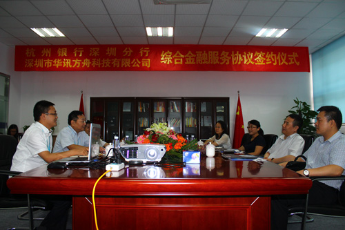 7月25日,杭州銀行深圳分行與華訊方舟的綜合金融服務(wù)協(xié)議簽約儀式在集團(tuán)總部舉行,杭州銀行深圳分行行長冷文廣及其代表,華訊方舟總裁黃永江、副總裁Sunny等領(lǐng)導(dǎo)共同出席了簽